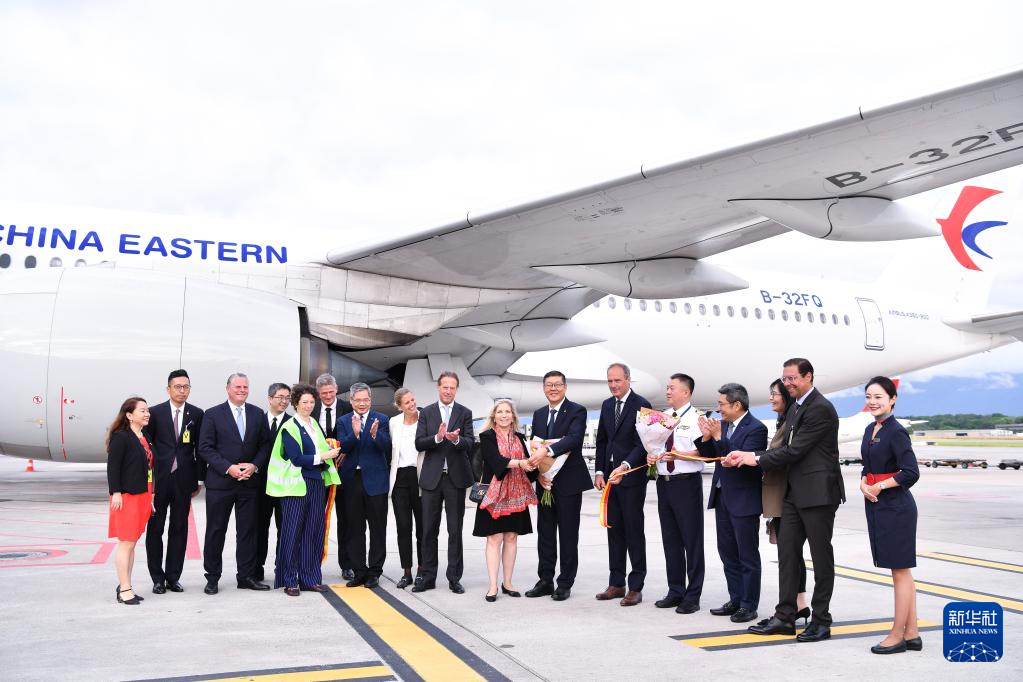 这是6月16日在瑞士日内瓦国际机场拍摄的中国东方航空公司上海至日内瓦直飞航线的剪彩仪式。