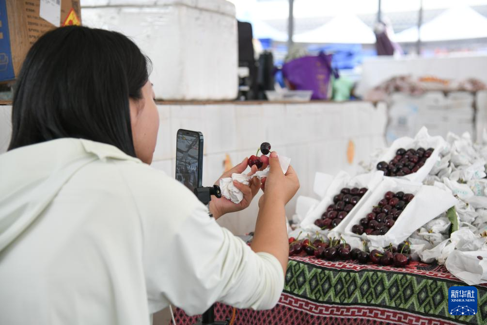 6月16日,在汉源县清溪镇水果交易市场,一名主播在直播售卖汉源樱桃。