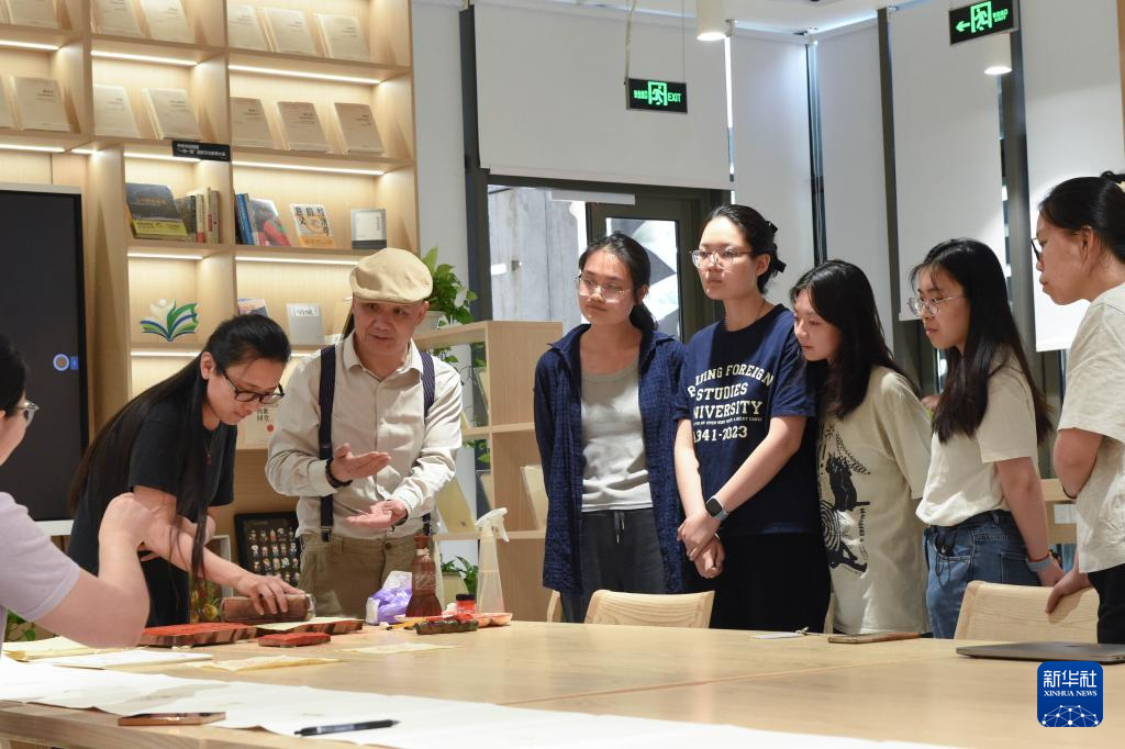6月17日,魏立中(左三)为北京外国语大学的师生讲授制作木版水印的技艺。