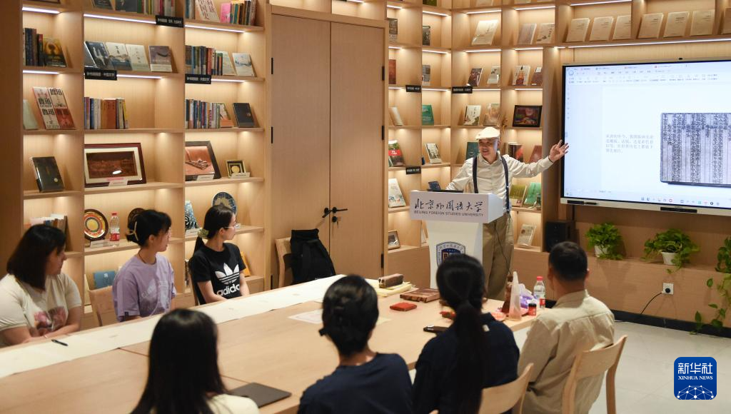 6月17日,魏立中(中)为北京外国语大学的师生讲授木版水印的历史源流与特色。