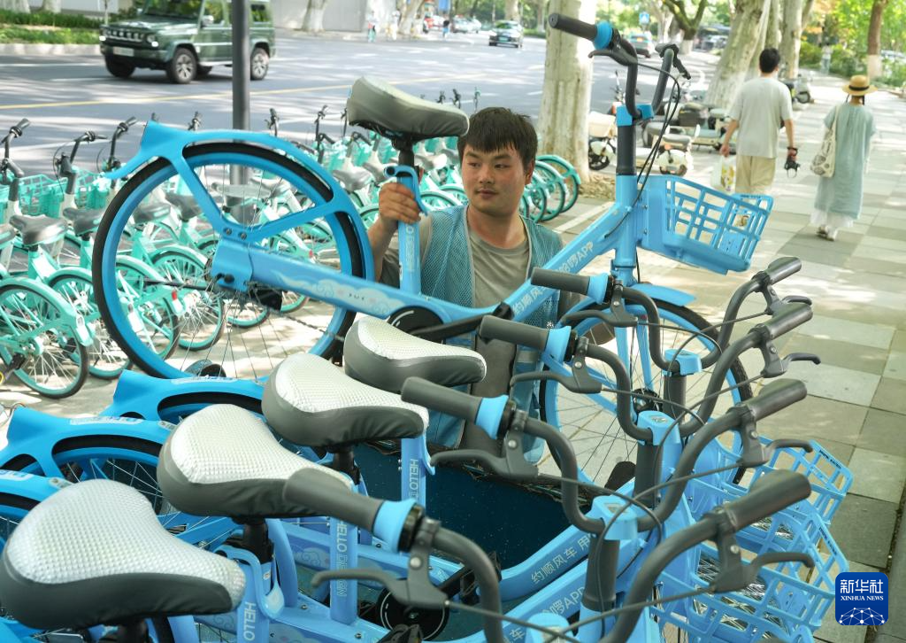 6月17日,工作人员将安装好清凉坐垫的共享单车投放到杭州西湖边。