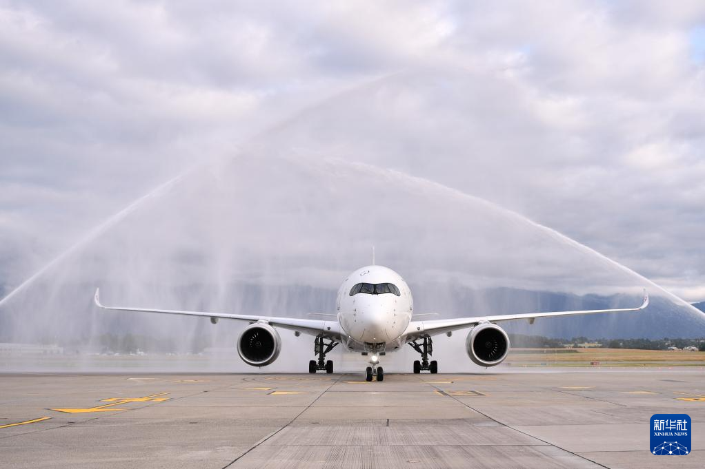 6月16日,在瑞士日内瓦,从上海浦东国际机场起飞的MU217航班穿过象征民航最高礼仪的“水门”。