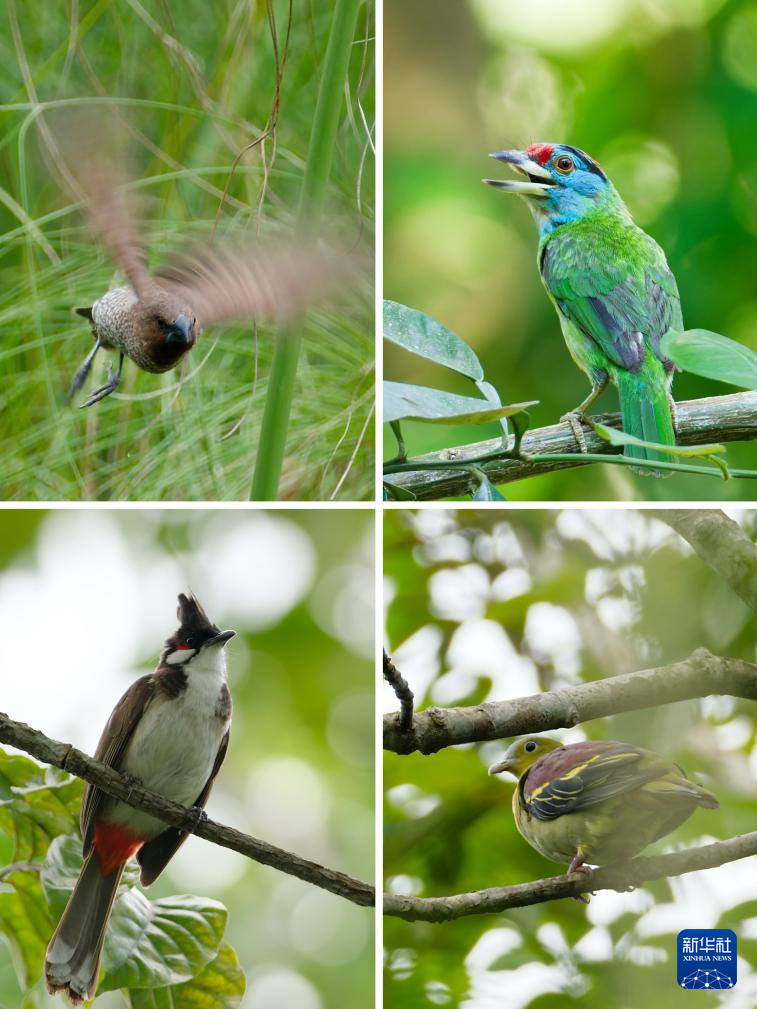 拼版照片:左上为斑文鸟;右上为蓝喉拟啄木鸟;左下为红耳鹎;右下为灰头绿鸠(6月15日摄于中国科学院西双版纳热带植物园)。