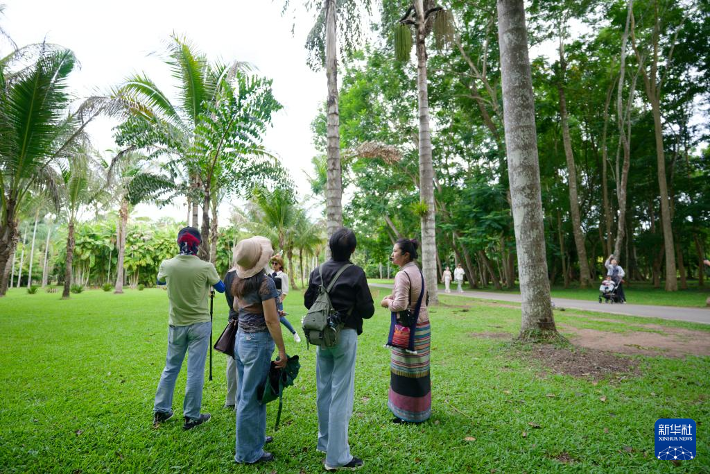 6月15日,讲解员(右一)在中国科学院西双版纳热带植物园向游客讲解热带雨林中常见的鸟类和植物。