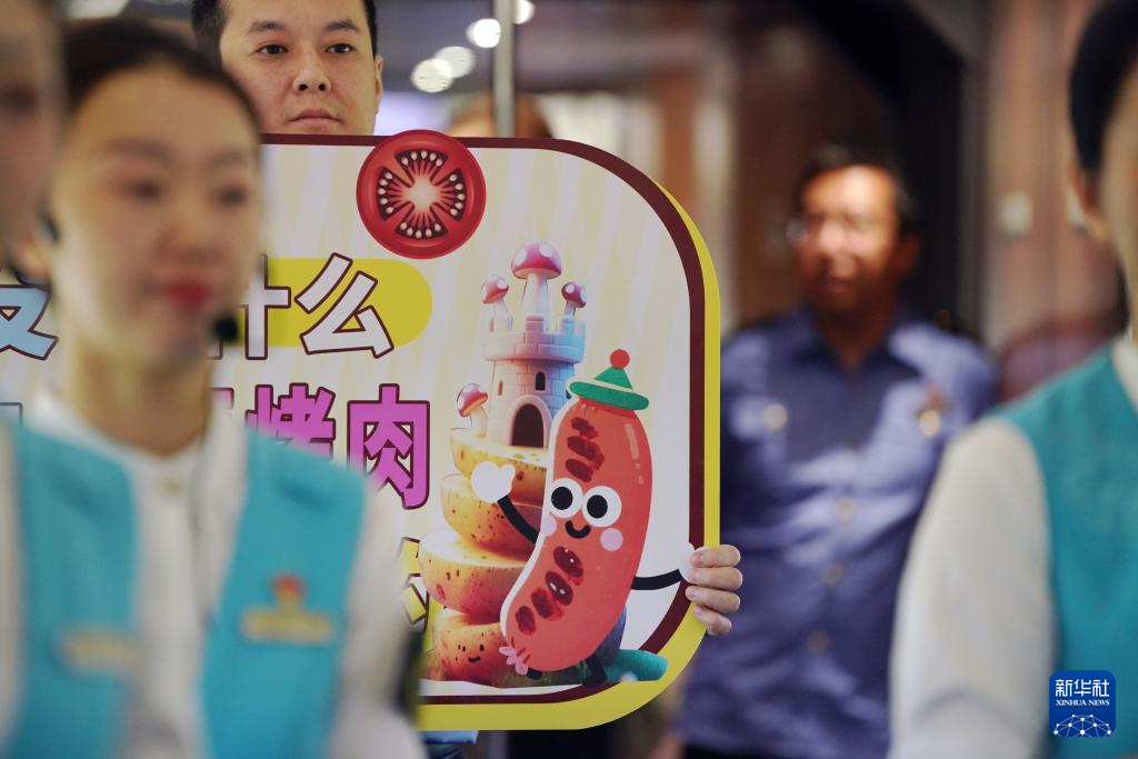 6月18日,乘务人员在D6993次动车组列车上为旅客展示齐齐哈尔烤肉卡通形象。