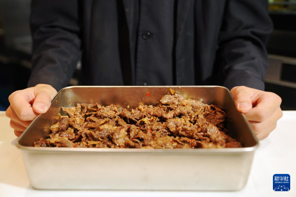 6月18日,乘务人员在D6993次动车组列车上为旅客准备用于体验拌制齐齐哈尔烤肉的生肉。