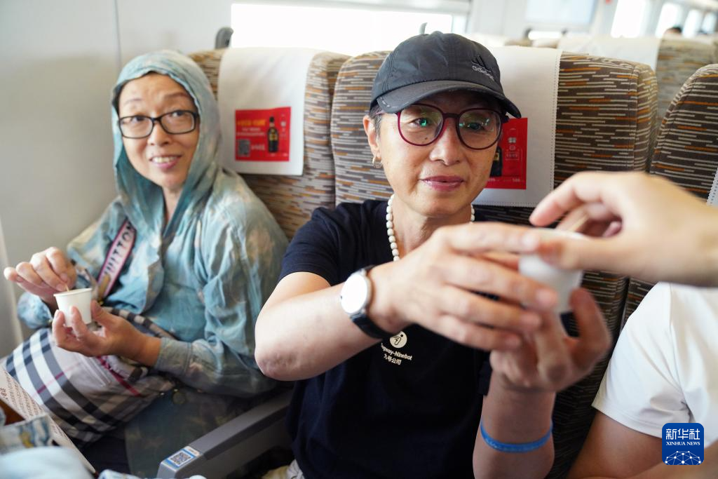 6月18日,两名旅客在D6993次动车组列车上品尝齐齐哈尔烤肉。