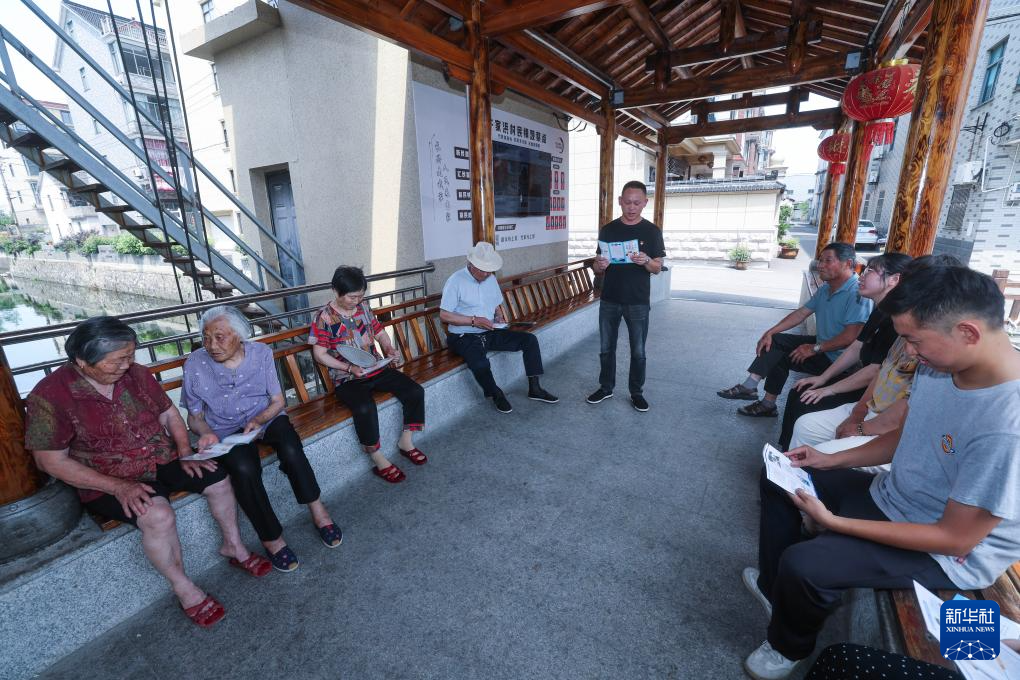 6月18日,长兴县李家巷镇许家浜村的“和治理事会”的党员志愿者(中)给村民普及夏季防溺水安全知识。
