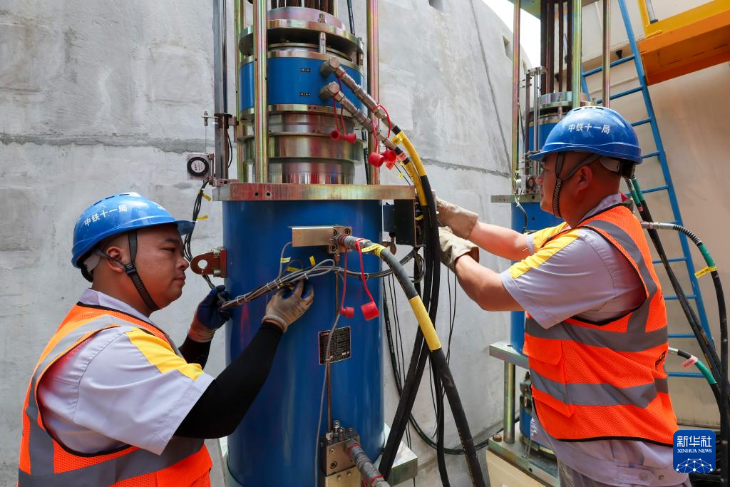 6月18日,作业人员在调试竖井掘进机配套设施。