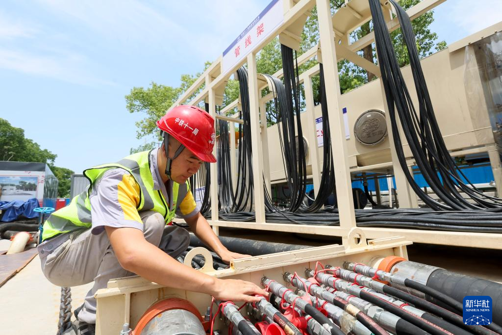 6月18日,作业人员在检查竖井掘进机液压管路。