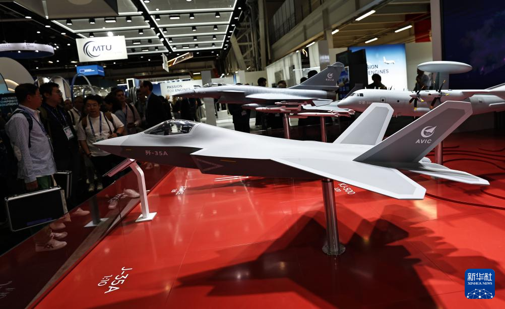 6月17日,在法国巴黎近郊布尔歇机场举行的第55届巴黎航展上,人们在中国航空工业集团展台参观歼-35A、歼-10CE等模型。