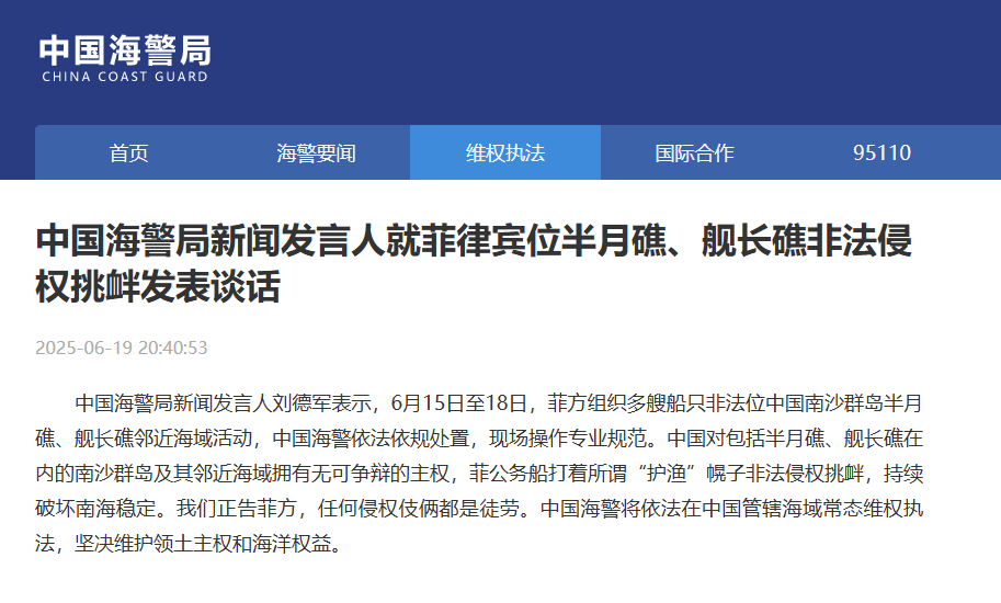 中国海警局新闻发言人刘德军表示,6月15日至18日,菲方组织多艘船只非法位中国南沙群岛半月礁、舰长礁邻近海域活动,中国海警依法依规处置,现场操作专业规范。中国对包括半月礁、舰长礁在内的南沙群岛及其邻近海域拥有无可争辩的主权,菲公务船打着所谓“护渔”幌子非法侵权挑衅,持续破坏南海稳定。我们正告菲方,任何侵权伎俩都是徒劳。中国海警将依法在中国管辖海域常态维权执法,坚决维护领土主权和海洋权益。
