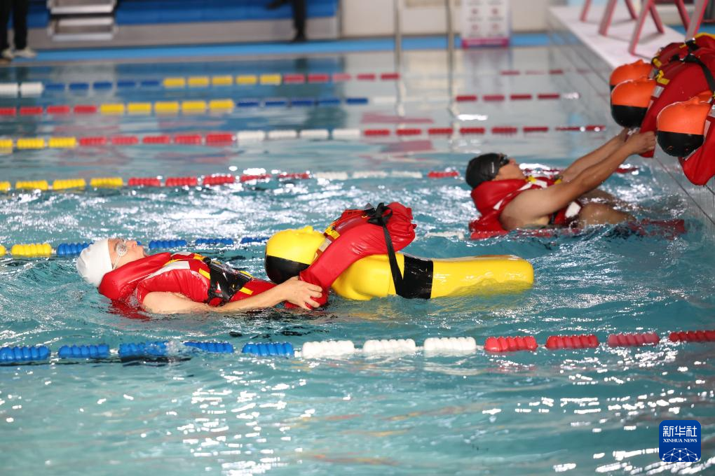 6月18日在上海海洋大学游泳馆拍摄的水上求生(内陆组)竞赛现场。