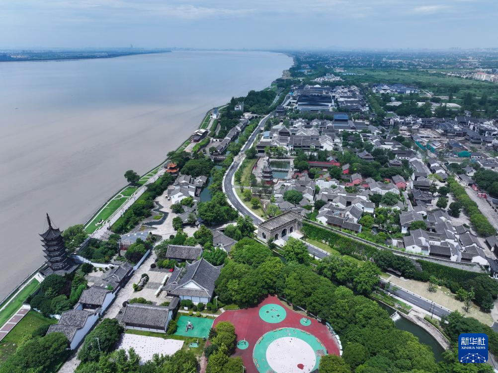 6月19日,空中俯瞰毗邻钱塘江的盐官古城潮乐之城(无人机照片)。