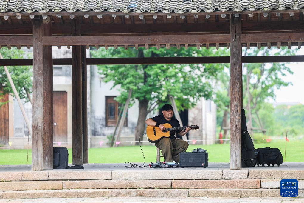 6月19日,一名乐手在盐官古城潮乐之城内演唱民谣作品。