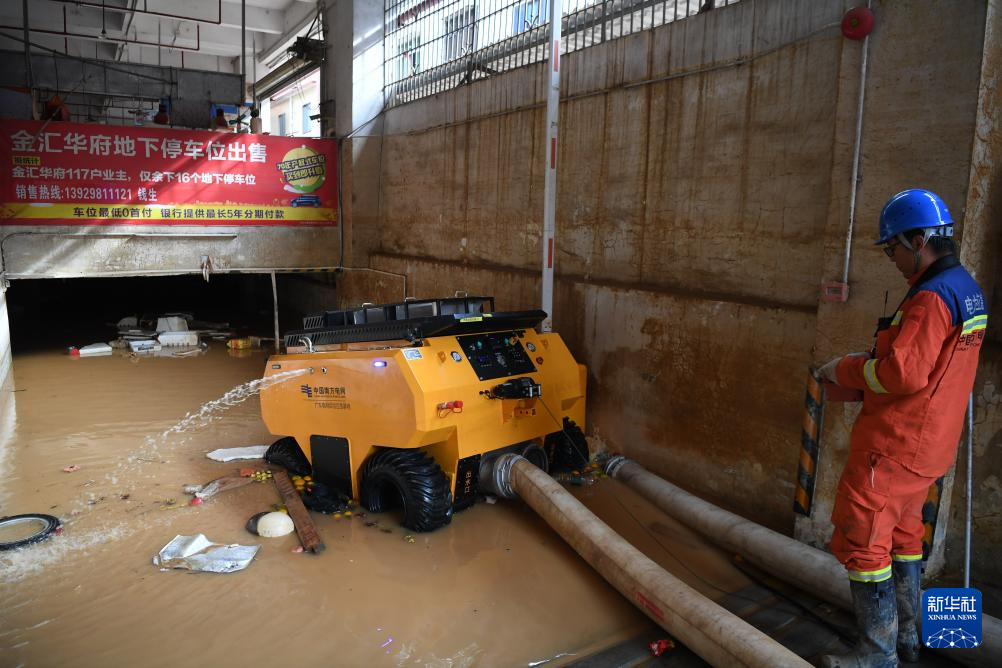 6月19日,在广东省肇庆市怀集县城的金汇华府地下车库,南方电网工作人员操作排涝机器人抽水。