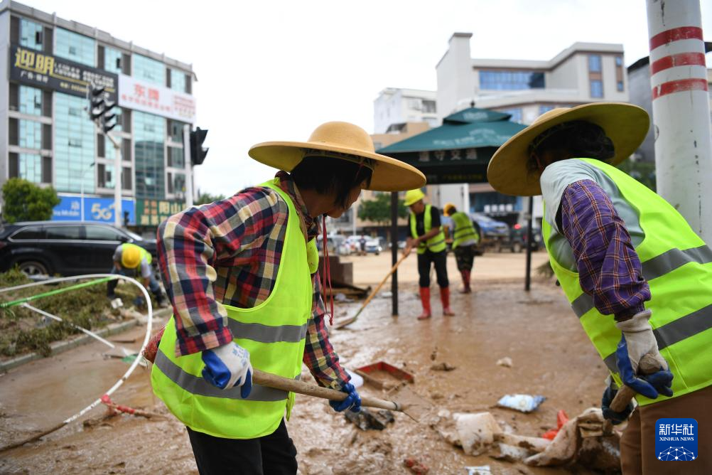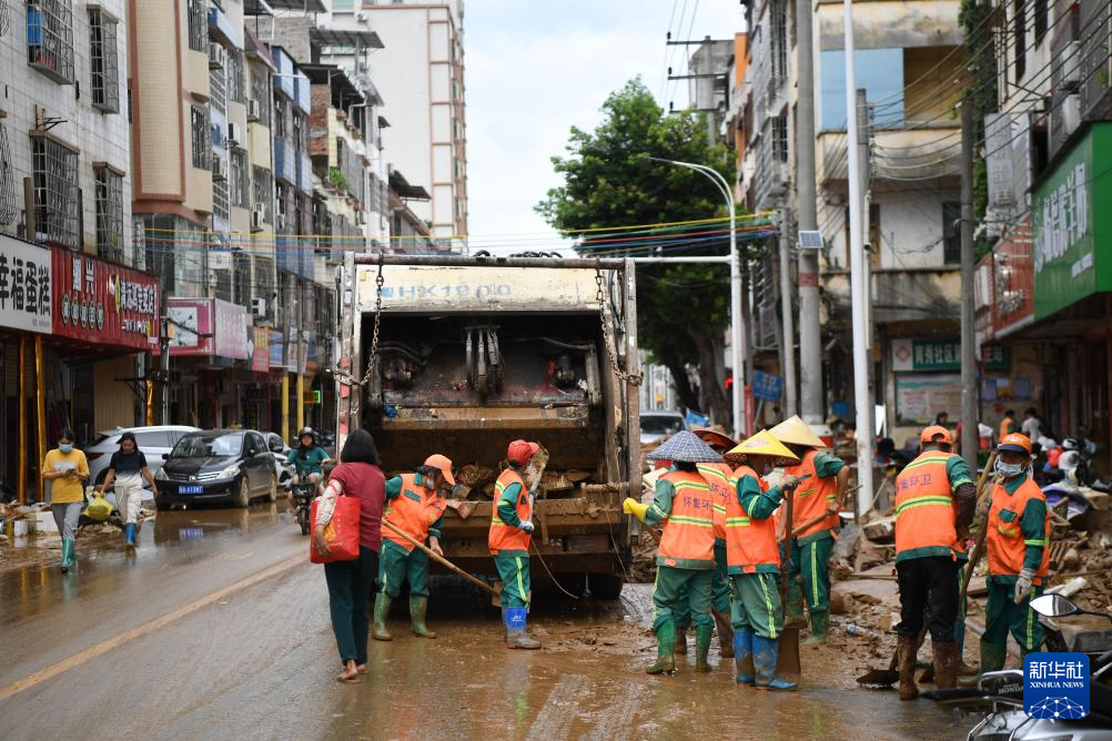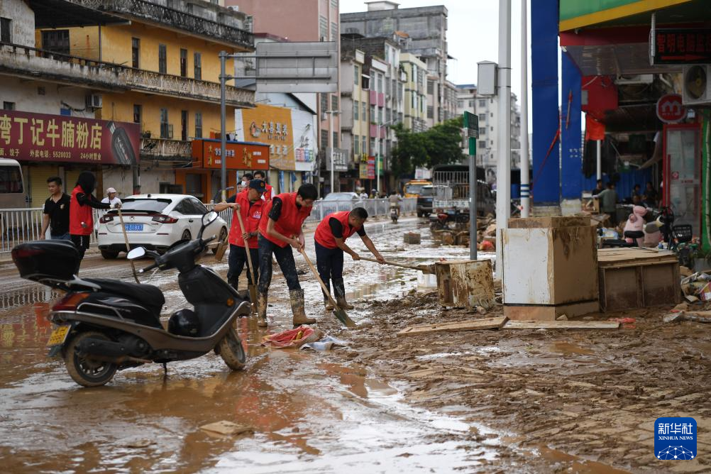 6月19日,志愿者在广东省肇庆市怀集县城的三江路清理杂物。