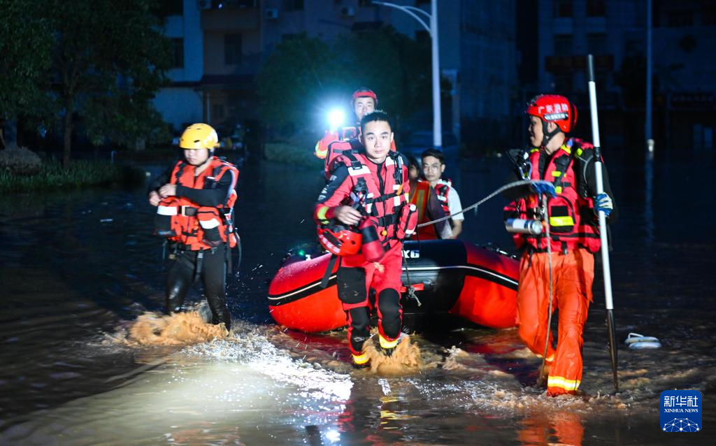 6月18日,消防救援人员在广东省肇庆市怀集县城的站前大道转移群众。