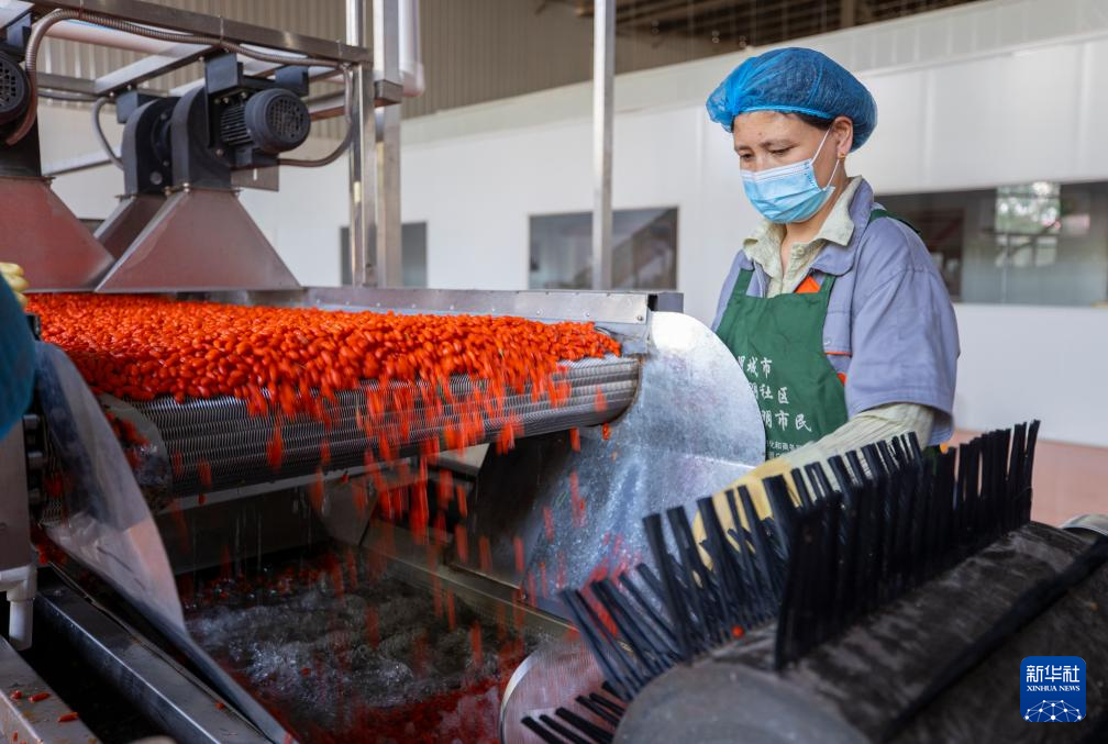 6月20日,在宁夏同心县河西镇一家枸杞企业,工作人员在清洗枸杞。