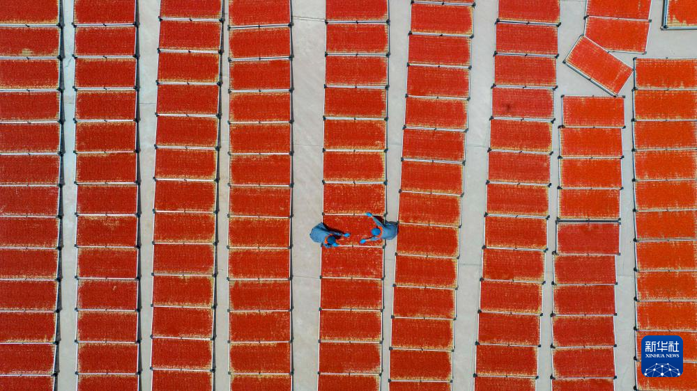 6月20日,在宁夏同心县河西镇一家枸杞企业,工作人员在晾晒枸杞(无人机照片)。