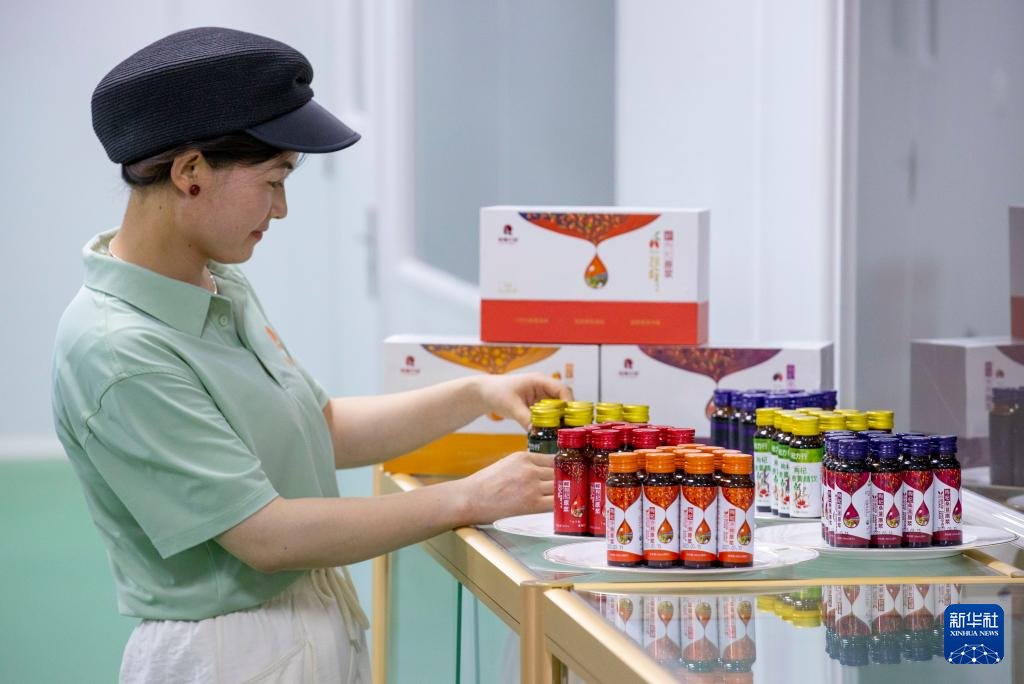 6月20日,在宁夏同心县河西镇一家枸杞企业,工作人员展示枸杞深加工产品。