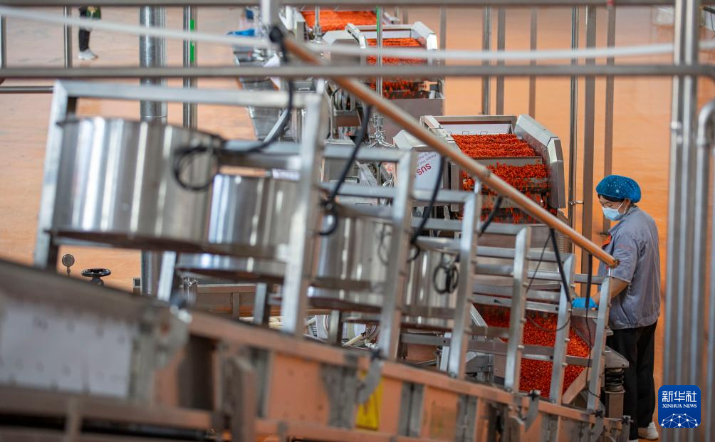 6月20日,在宁夏同心县河西镇一家枸杞企业,工作人员在加工枸杞原浆。