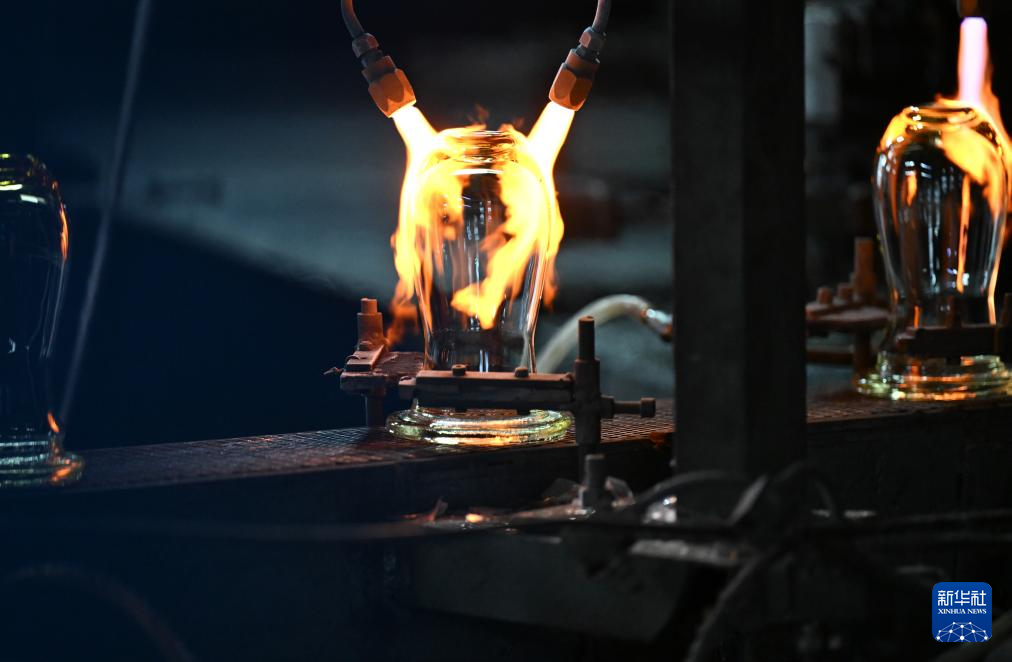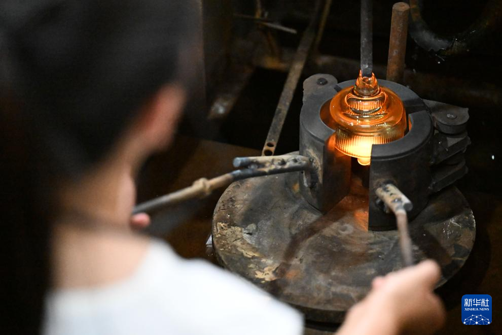 工作人员在山西省祁县山西大华玻璃实业有限公司吹制玻璃器皿(6月12日摄)。