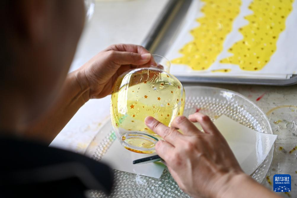 工作人员在山西省祁县山西宏艺玻璃器皿有限责任公司为玻璃器皿贴花(6月12日摄)。
