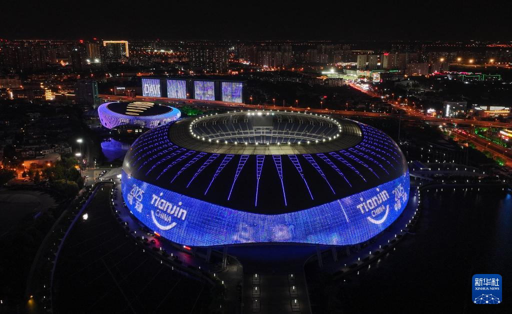 天津奥体中心体育场点亮夏季达沃斯主题灯光(无人机照片,6月20日摄)。