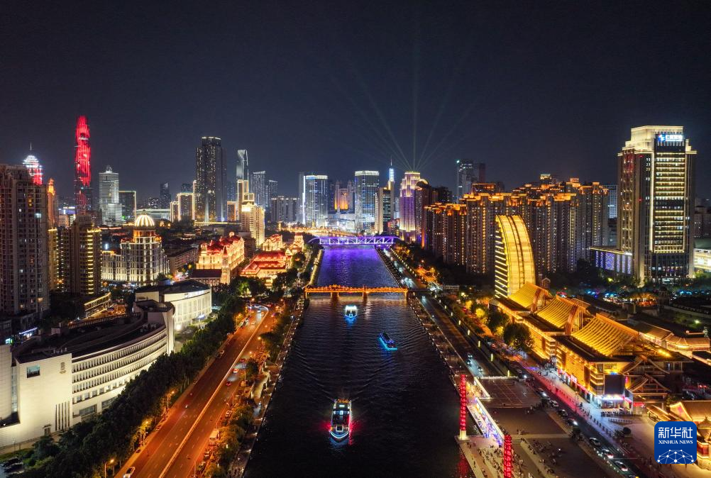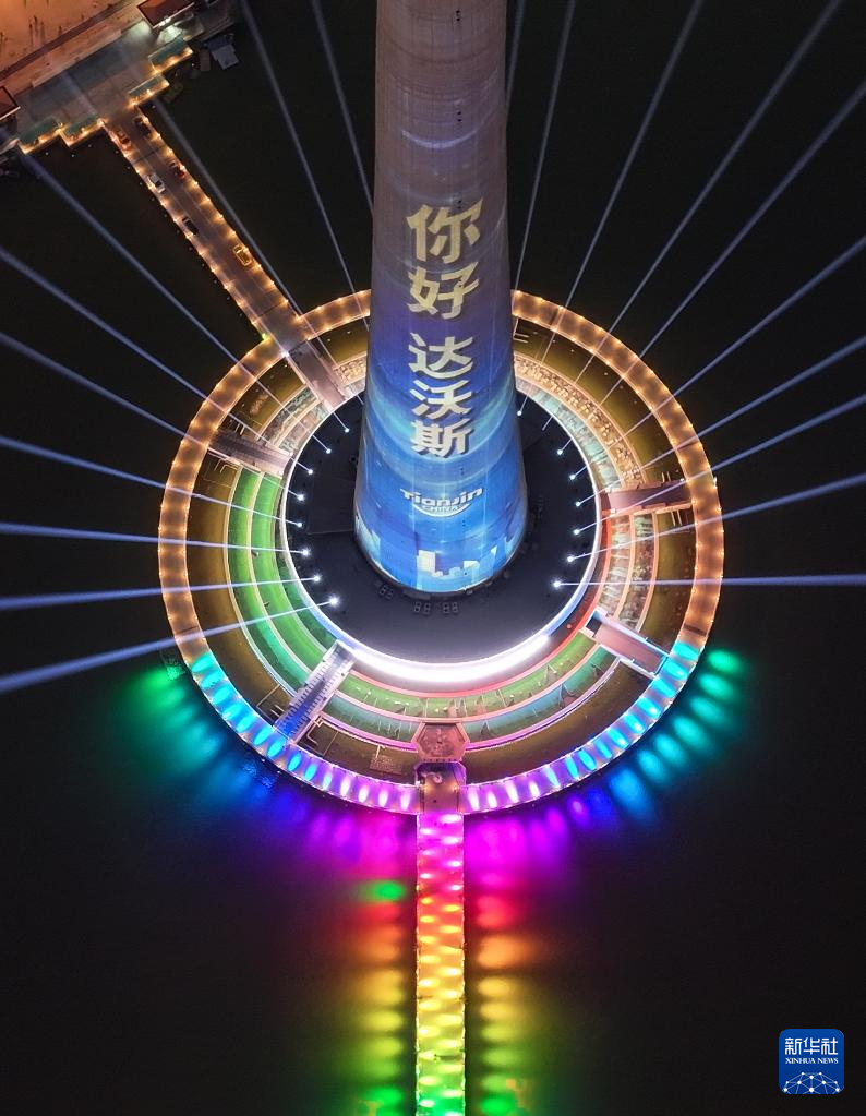 世界经济论坛第十六届新领军者年会(又称“夏季达沃斯论坛”)即将在天津开幕。夜色下的天津灯光璀璨,多座地标性建筑点亮楼体灯光,流光溢彩迎接中外宾朋。