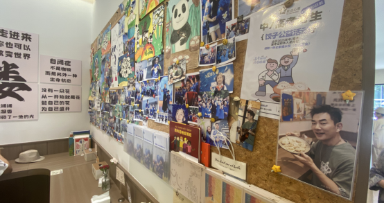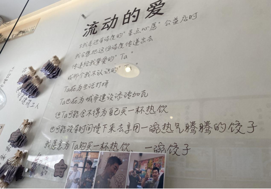 在“星点心愿”茶咖饺子店的店内和店外,随处可见的提示语,引导更多人走近孤独症人群,增进对他们的理解和接纳。由于店里超温馨布置,已成为福州新晋网红打卡点。
