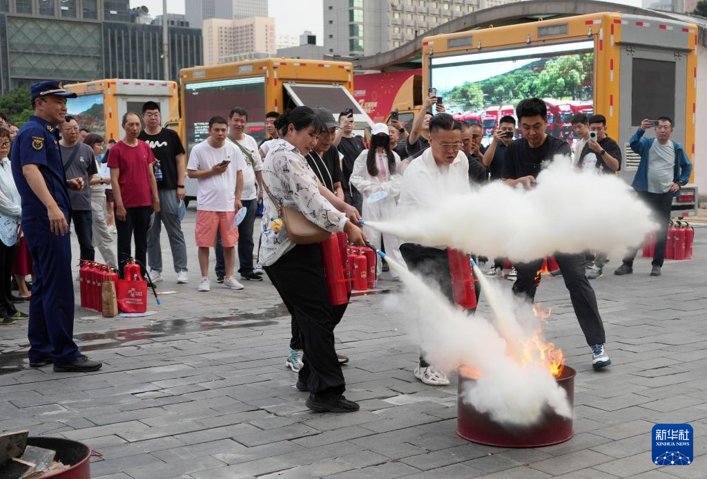 6月24日,在沈阳辽宁工业展览馆广场,市民参加灭火演练。