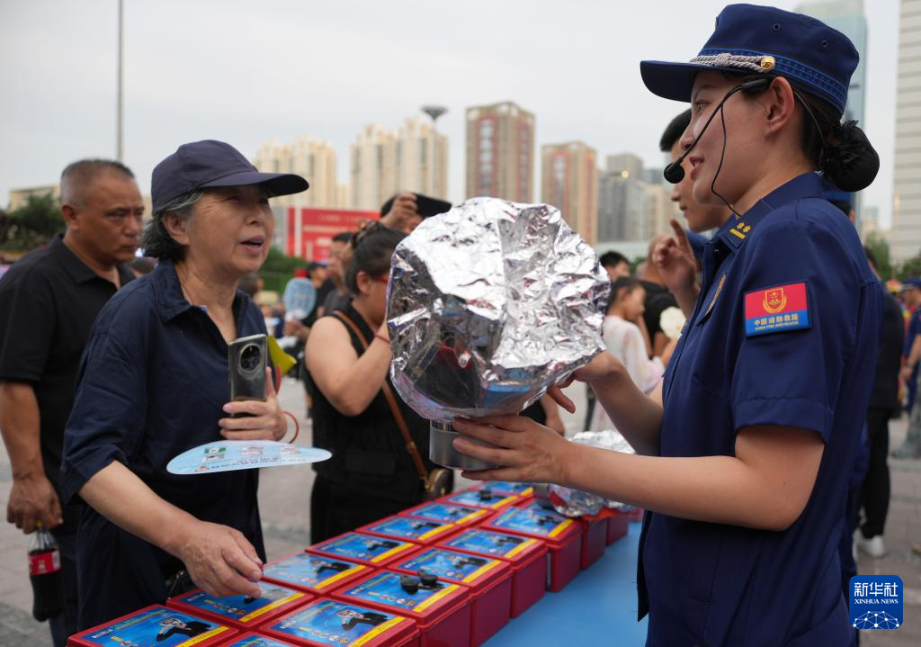 6月24日,在沈阳辽宁工业展览馆广场,消防员(左)向市民讲解燃气使用安全知识。