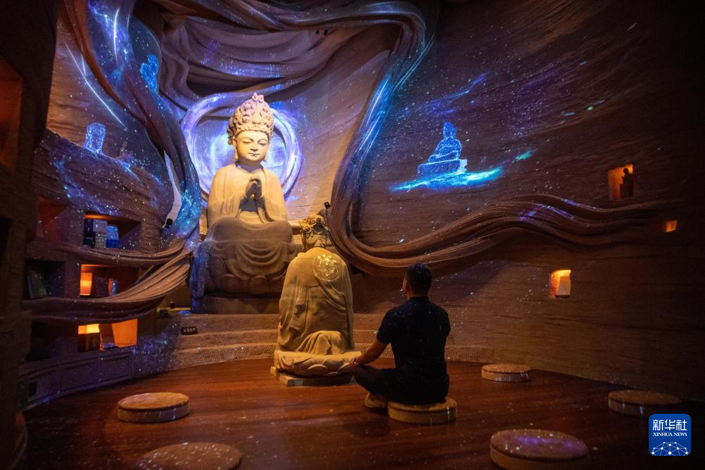 6月24日,游客在大足石刻景区一处数字化声光场景中体验。