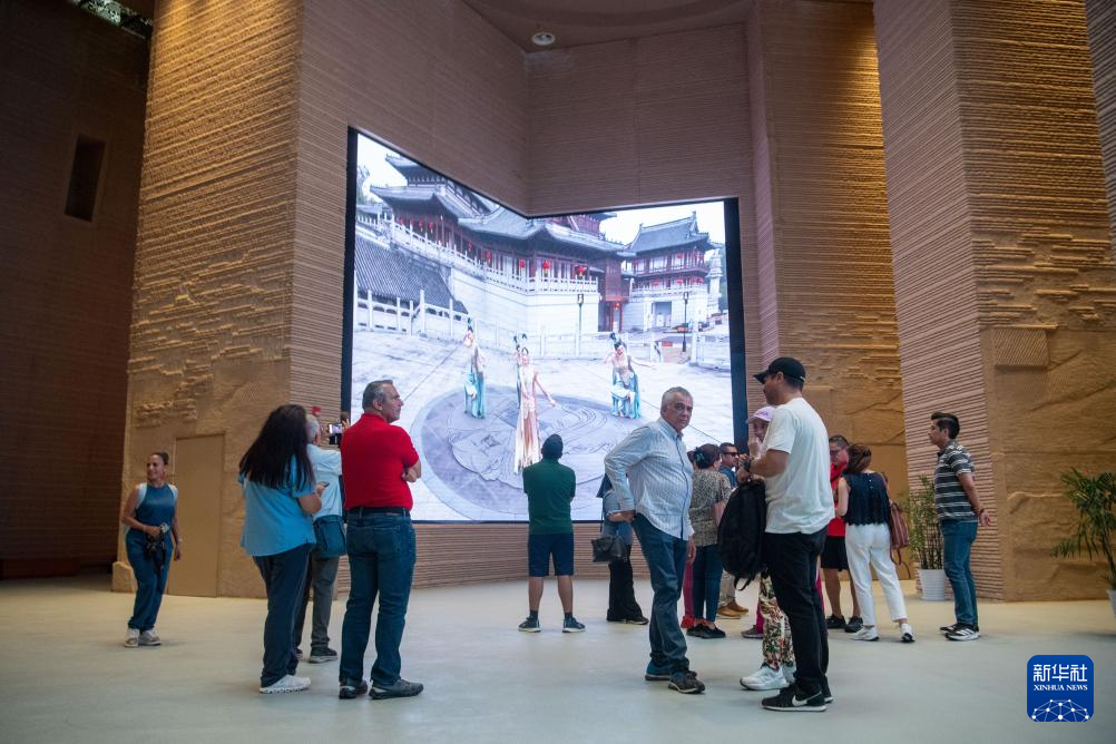 6月24日,游客在大足石刻景区观看8K球幕电影。