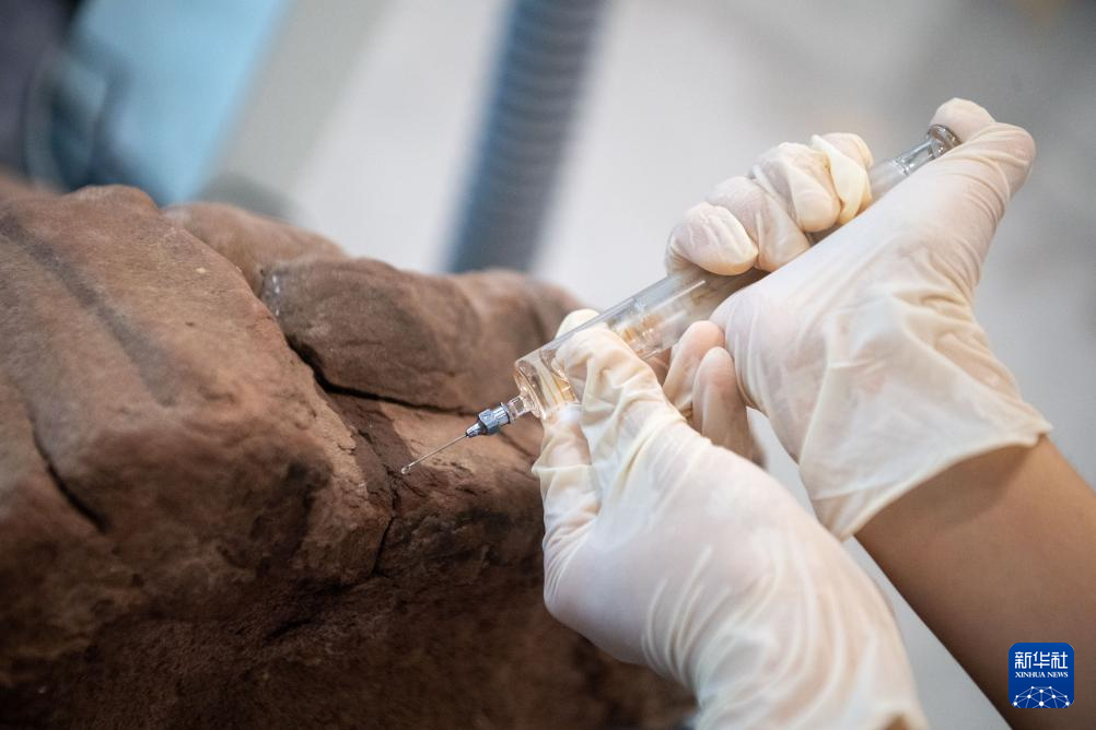 6月24日,在大足石刻文物医院,工作人员对石质文物进行修复。