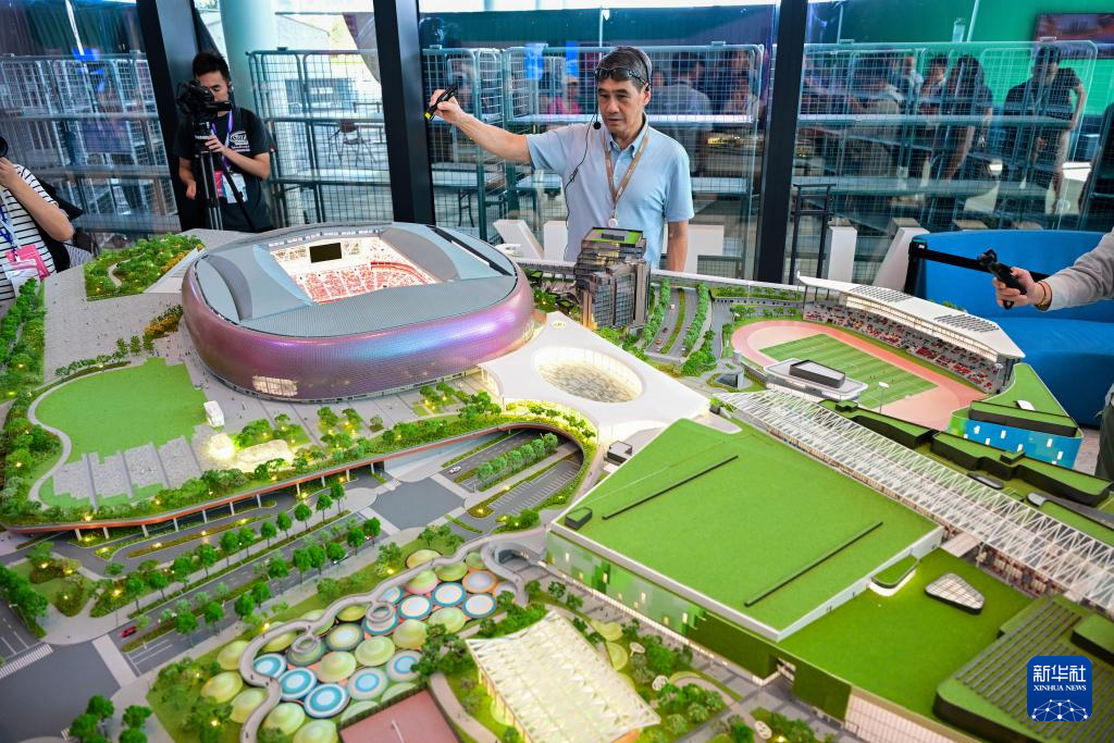 6月25日,启德体育园总监邓竟成向采访团成员介绍情况。新华社记者 朱炜 摄