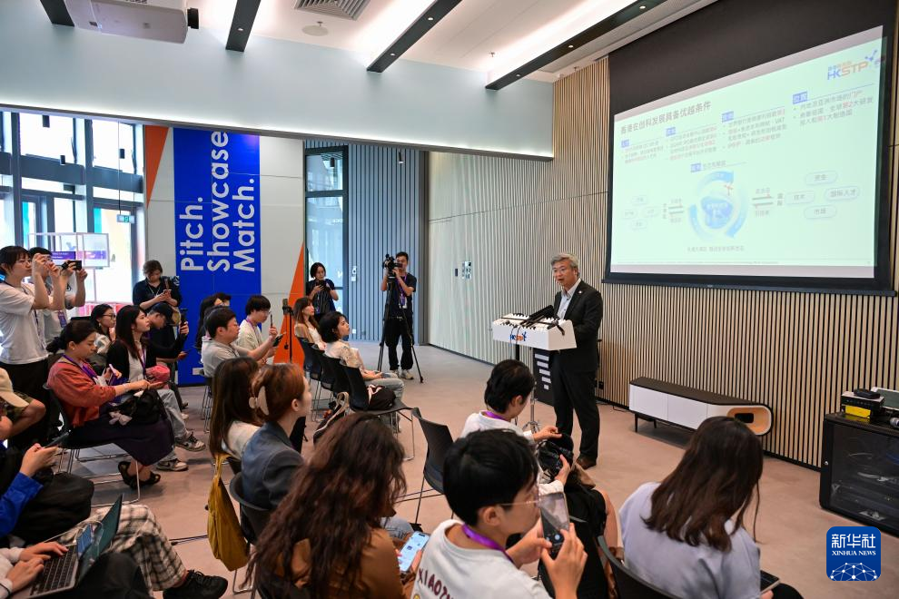6月24日,香港科技园公司初创企业生态圈培育及发展总监粘清泽向采访团成员介绍情况。新华社记者 朱炜 摄