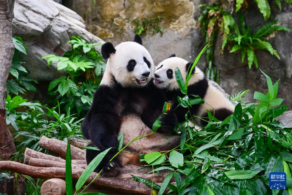 6月24日,在香港海洋公园,大熊猫宝宝“加加”(右)和母亲“盈盈”在一起。新华社记者 朱炜 摄