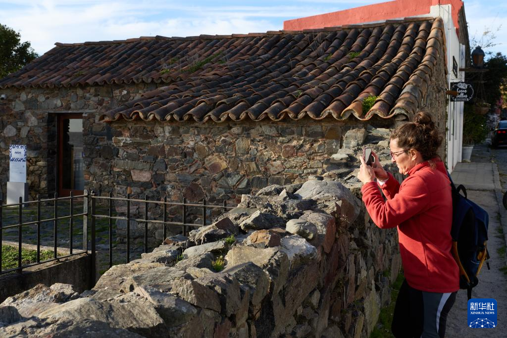6月25日,一名女子在乌拉圭科洛尼亚的老城区拍摄历史建筑。