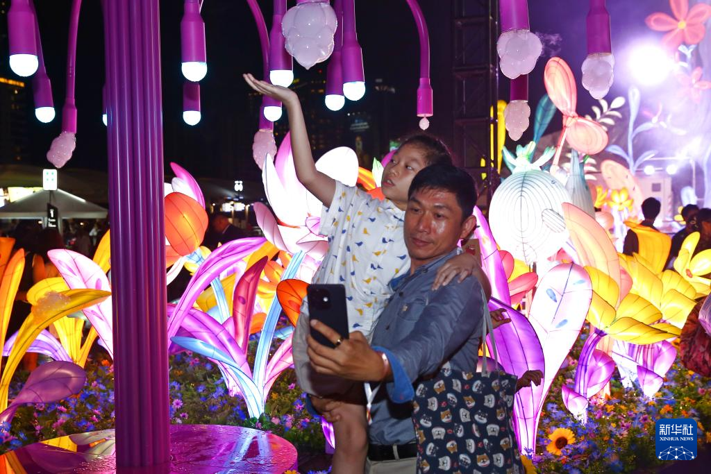 6月28日晚,在泰国曼谷商业地标暹罗天地,游客在灯会上拍照。新华社记者 孙玮彤 摄