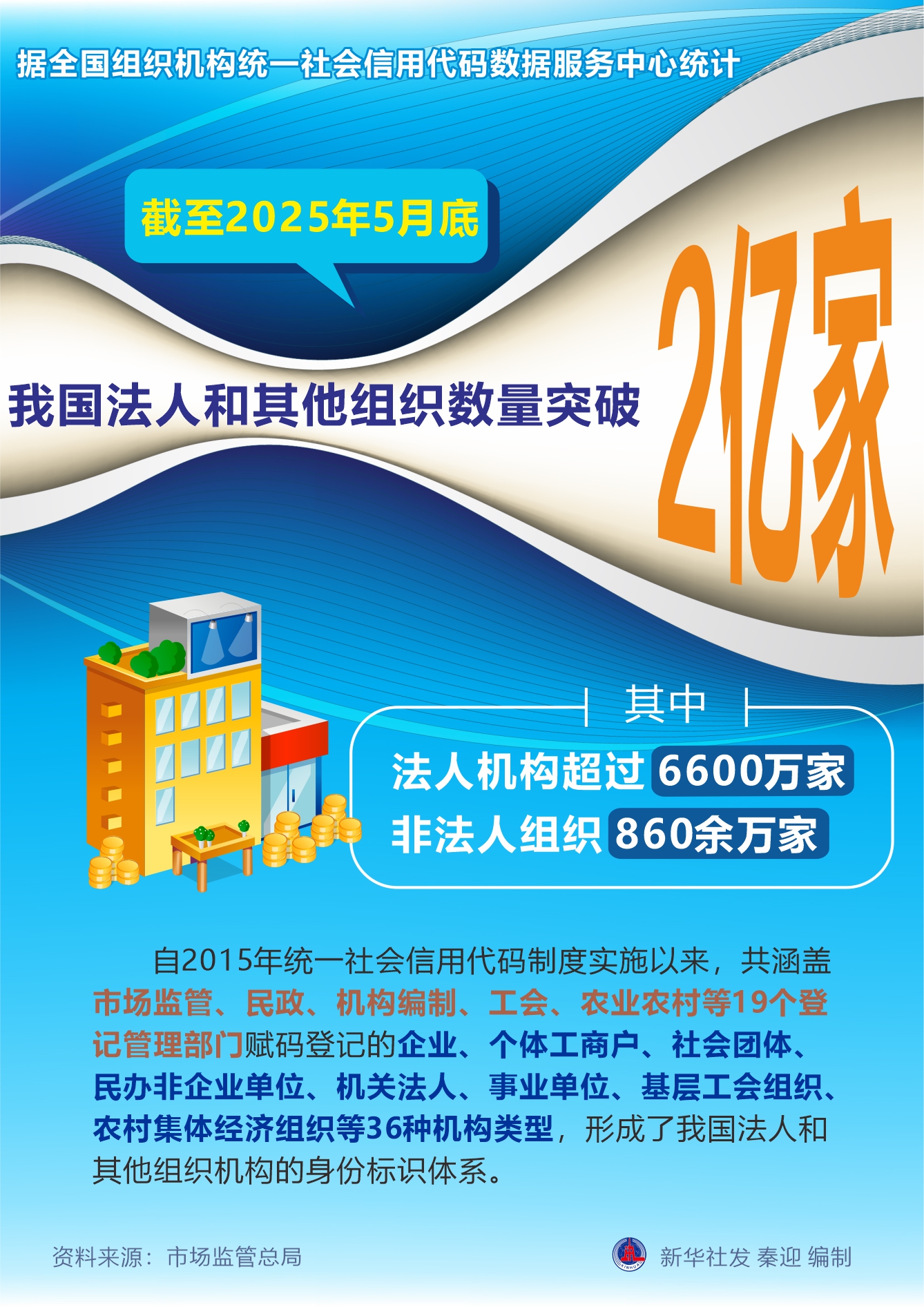 新华社北京6月30日电(记者赵文君)记者30日从市场监管总局获悉,据全国组织机构统一社会信用代码数据服务中心统计,截至2025年5月底,我国法人和其他组织数量突破2亿家,其中法人机构超过6600万家、非法人组织860余万家。