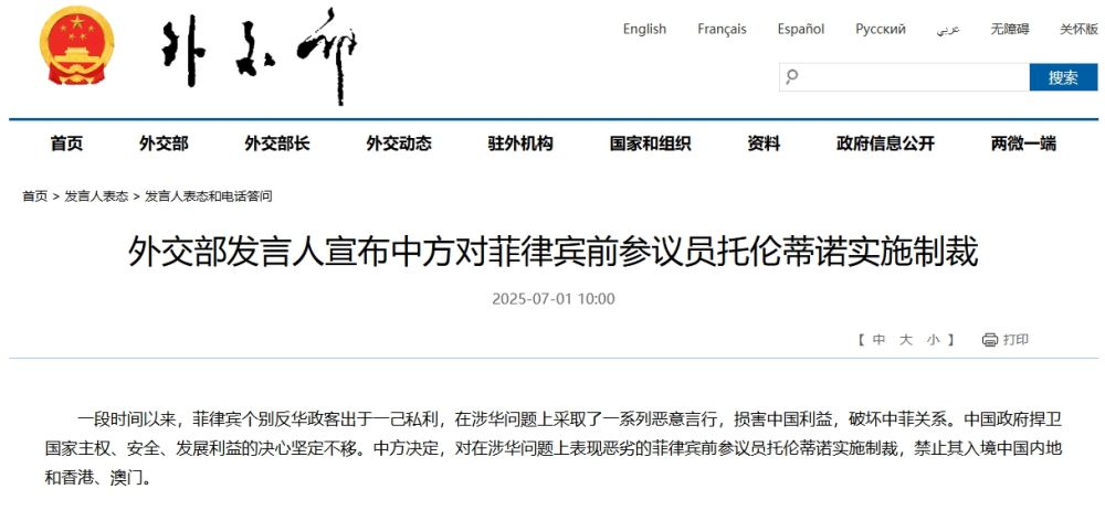外交部发言人宣布中方对菲律宾前参议员托伦蒂诺实施制裁