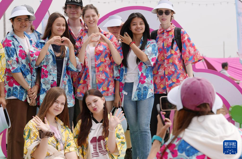 游客在大连金石滩快乐海岸合影(6月28日摄)。