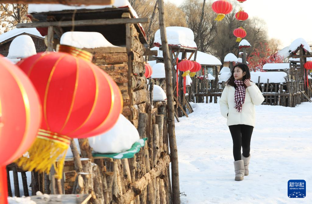 2025年1月15日,一名来自缅甸的游客在辽阳市太子河畔参观雪乡小屋。