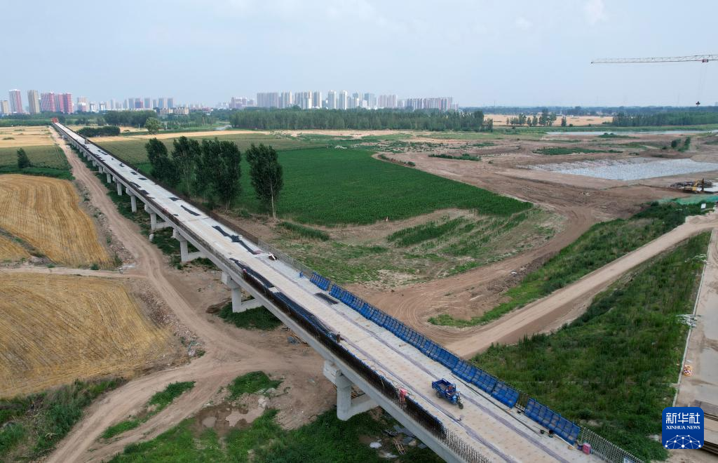 6月29日,中铁十八局集团的工人在兰沟洼蓄滞洪区(高碑店段)东马营撤退桥建设工地施工(无人机照片)。