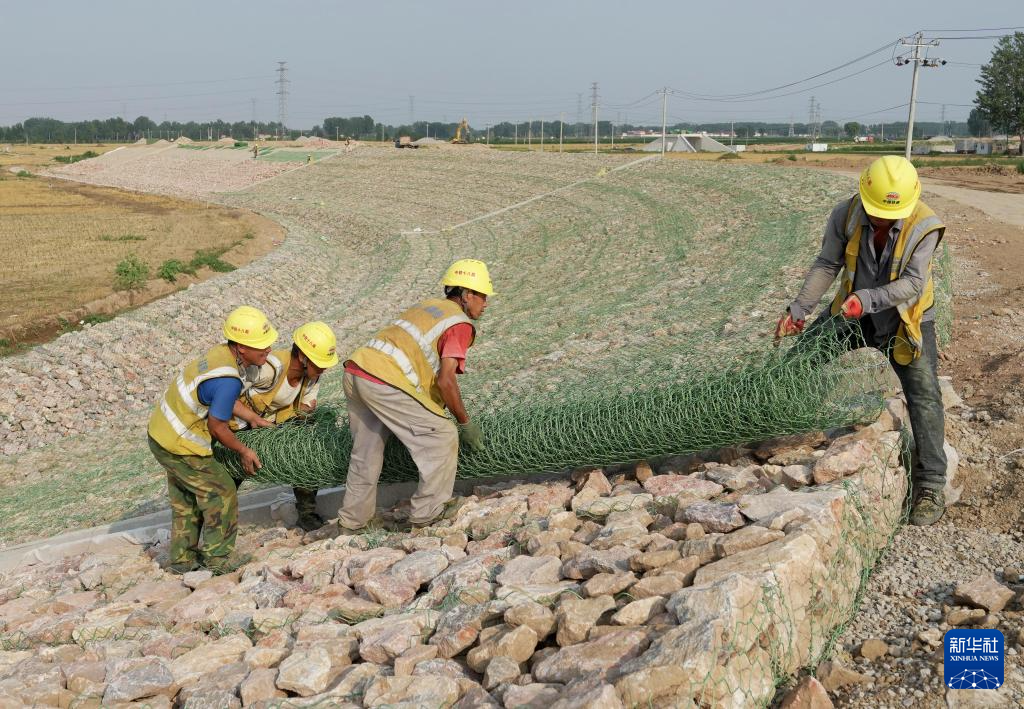 6月29日,中铁十八局集团的工人在兰沟洼蓄滞洪区(高碑店段)新古城镇安全区围堤建设工地施工。