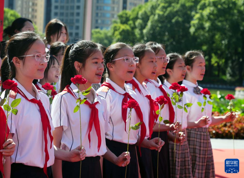 7月1日,学生们在中共一大纪念馆前合唱《没有共产党就没有新中国》。
