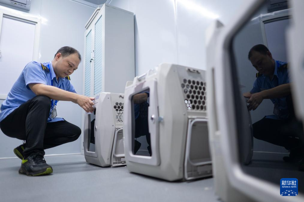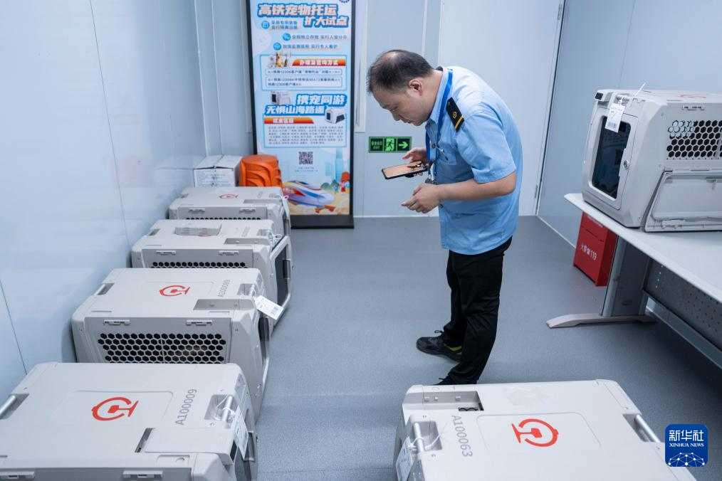 7月1日,武汉站工作人员检查专用宠物运输箱功能运行情况。