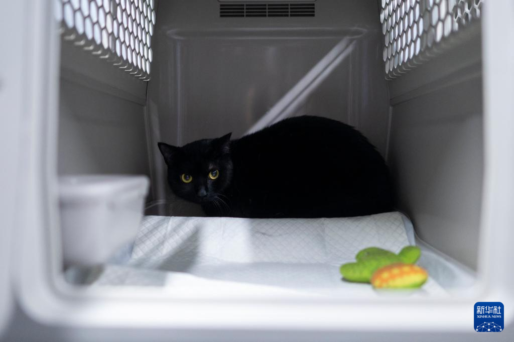 7月1日,一只宠物猫被旅客放进专用宠物运输箱内。